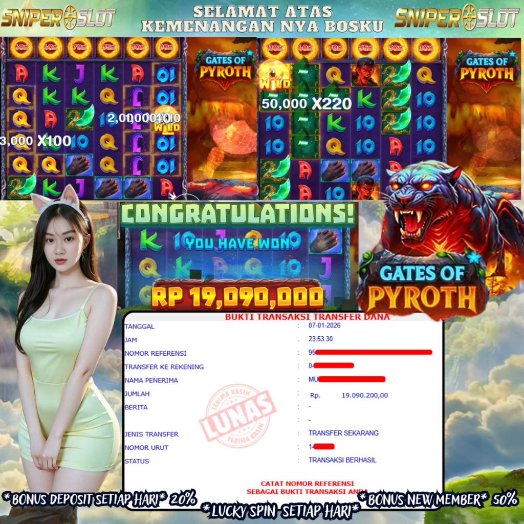 Selamat Kepada Member Setia SNIPERSLOT dengan USER ID : RIAN****03 GATE OF PYROTH. RP 19.090.200,- di bayar LUNAS langsung mendarat ke rekening tanpa bertele – tele