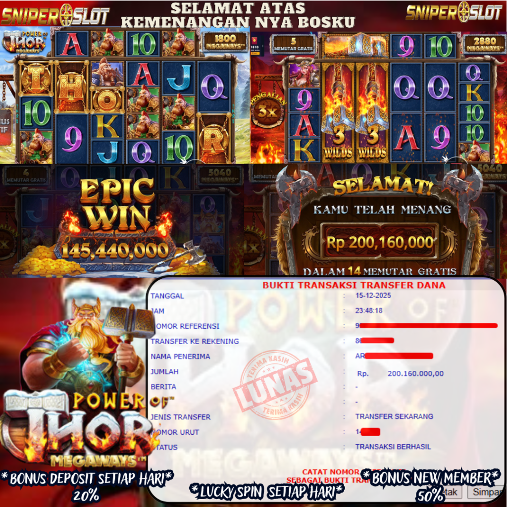 Selamat Kepada Member Setia SNIPERSLOT dengan USER ID : EWA****22 Power of Thor Megaways™. RP 200.160.000,- di bayar LUNAS langsung mendarat ke rekening tanpa bertele – tele